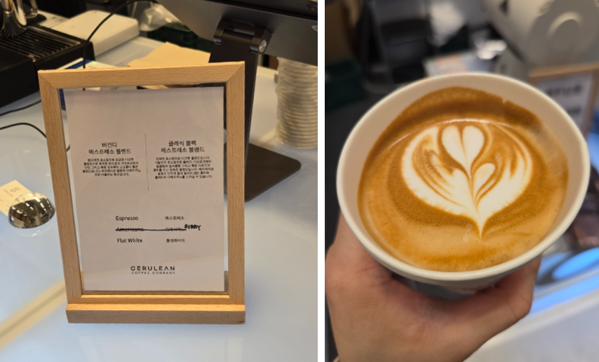 저희는 클래식과 버건디 원두의 플랫화이트 커피를 각각 주문했는데 커피가 진해서 맛있었어요.